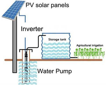 A solar-powered pump is a pump running on electricity generated by photovoltaic panels or the radiated thermal energy available from collected sunlight as opposed to grid electricity or diesel run water pumps.The operation of solar powered pumps is more economical mainly due to the lower operation and maintenance costs and has less environmental impact than pumps powered by an internal combustion engine (ICE). Solar pumps are useful where grid electricity is unavailable and alternative sources (in particular wind) do not provide sufficient energy.